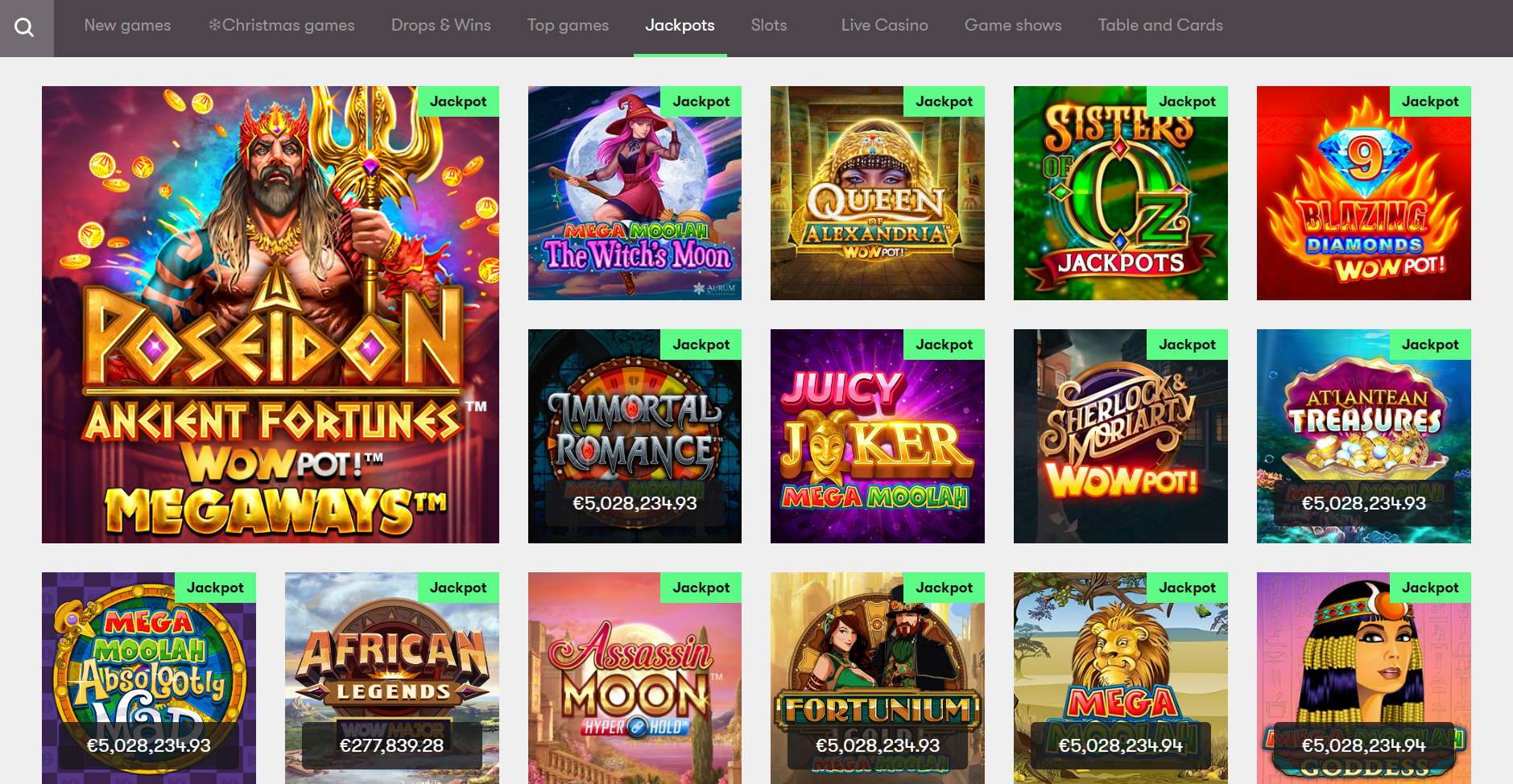 Jackpot sa dosiahne vtedy, keď určitá kombinácia spustí výhru vo výške minimálne 100 %. Inými slovami, keď hráč hrá hazardnú hru a trafí kľúčové číslo, odomknú sa mu všetky mince v automate. 10Bet ponúka šťastným rukám nekonečný počet hier s jackpotom. Medzi najobľúbenejšie patrí „Mega Moolah“, ktorá obsahuje legendárny kreslený microgaming.